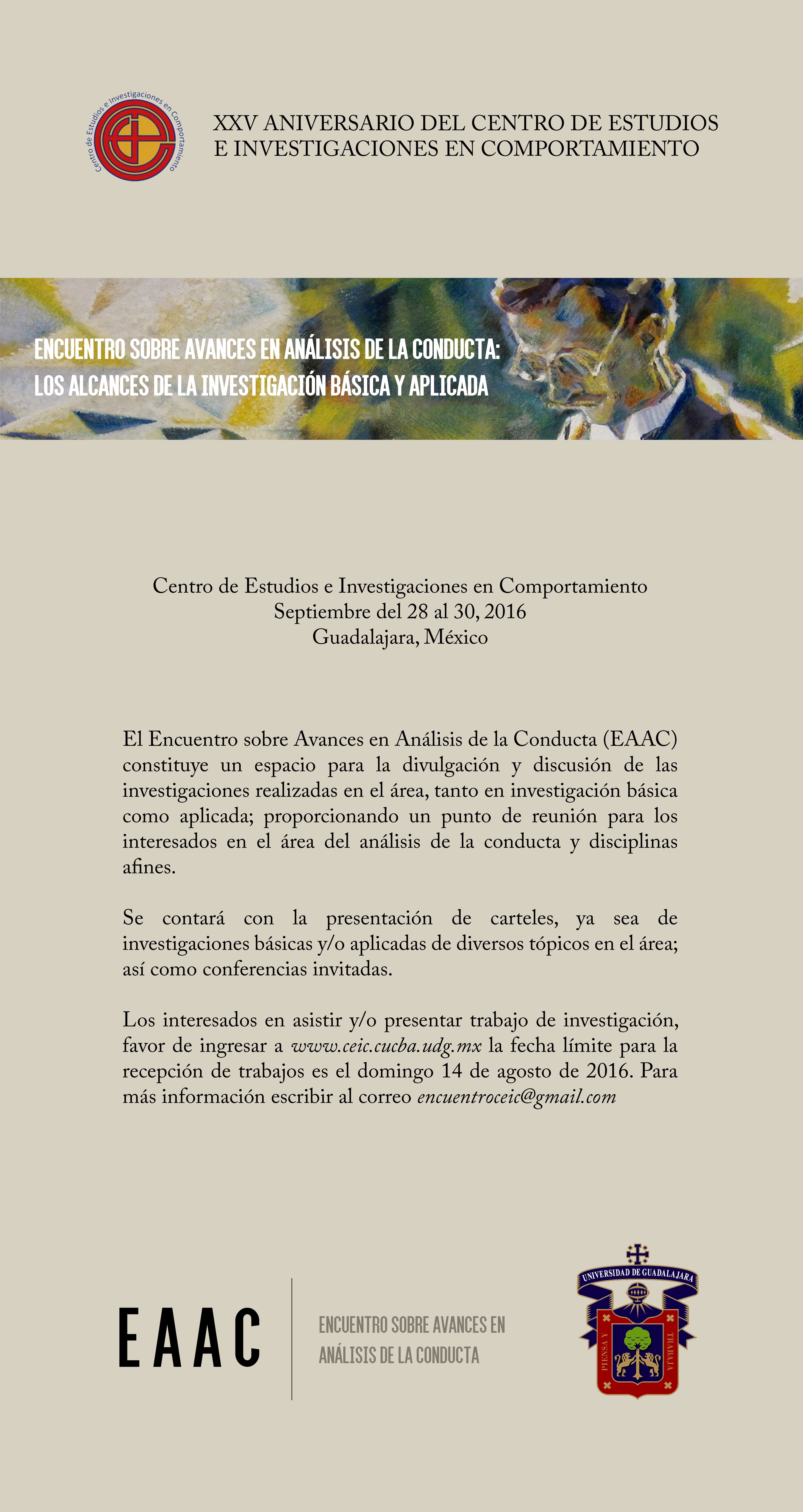 Con el propósito de divulgar los resultados de las investigaciones realizadas, crear una vía de comunicación y un posible enlace para investigaciones futuras, así como identificar áreas de oportunidad y mejorar la práctica científica de la psicología. Se les hace una cordial invitación a investigadores, docentes, estudiantes de licenciatura, posgrados y a personas interesadas en discutir tópicos relacionados con los estudios de investigación ya sea básico y aplicado dentro del análisis de la conducta y disciplinas afines.