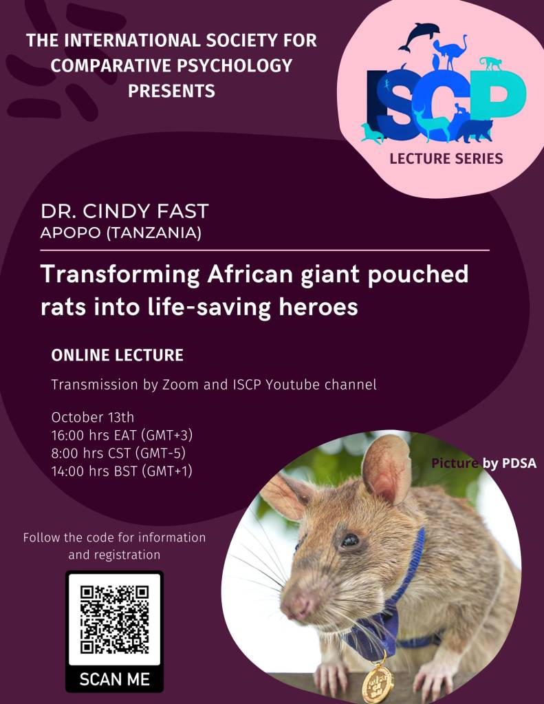 Les invitamos a participar de la conferencia organizada por International Society for Comparative Psychology y que tendrá como expositora a la Dra. Cindy Fast (Tanzania) presentando al proyecto APOPO’s HeroRATs.