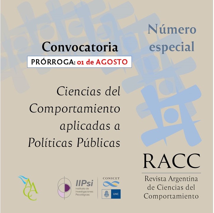 La Revista Argentina de Ciencias del Comportamiento – RACC (ISSN: 1852-4206) anuncia que se prorroga el plazo de envío de artículos para el número especial *Ciencias del Comportamiento aplicadas a Políticas Públicas*.