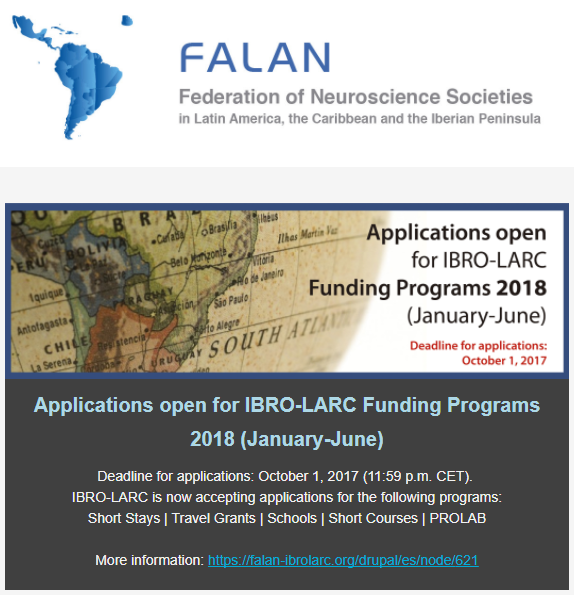El Comité Regional de IBRO para América Latina (LARC) evaluará las solicitudes de financiación (hasta 1200 euros) para las visitas cortas a laboratorios de investigación/formación en la región latinoamericana que tendrán lugar entre el 1 de enero y el 30 de junio de 2018. Las solicitudes deberán presentarse en línea. No se aceptarán solicitudes por correo electrónico.